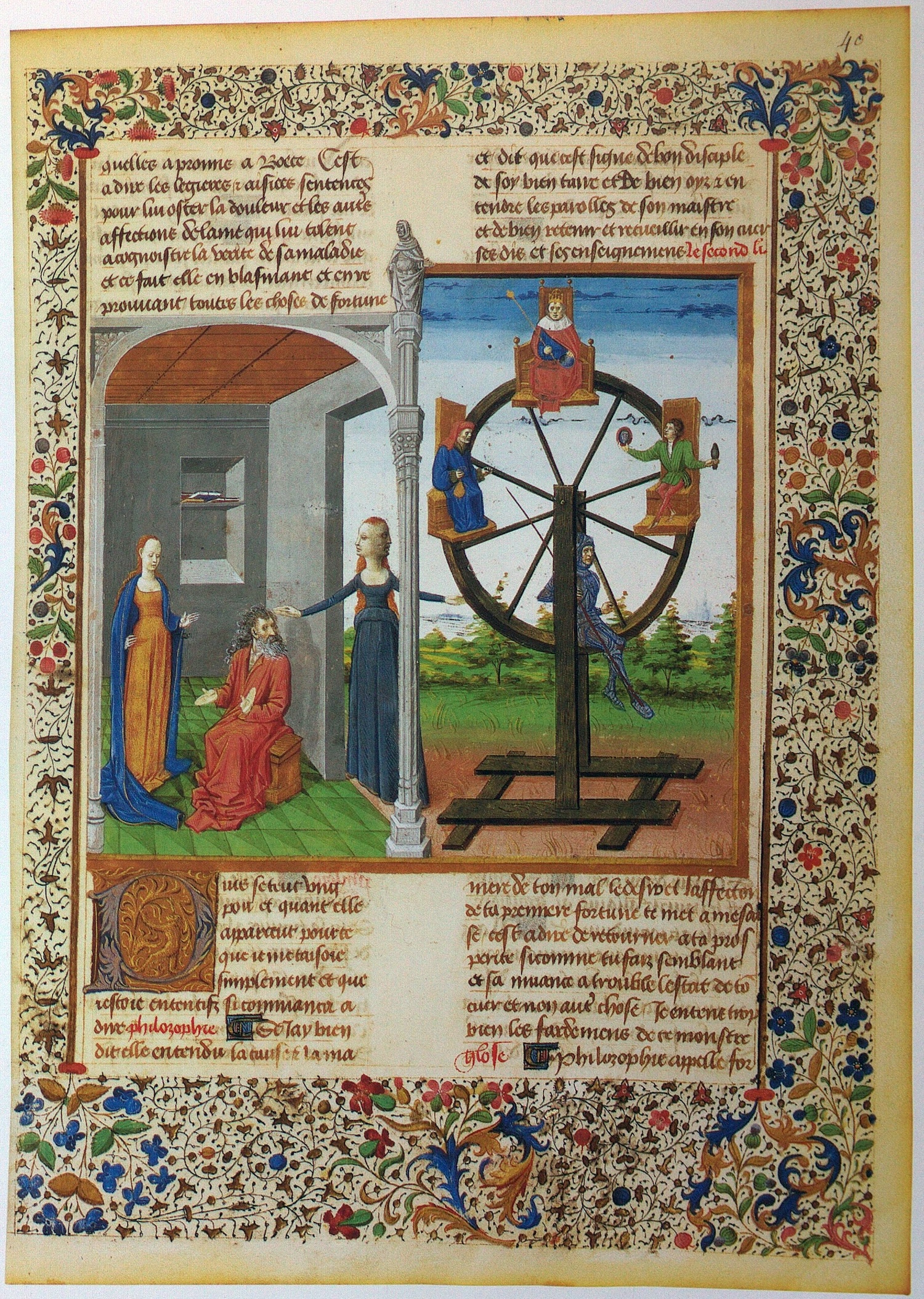 A page of a medieval French translation of Boethius’ „Consolation of Philosophy“ in the manuscript Paris, Bibliothèque nationale de France, Fr. 809, fol. 40r. The miniature shows Boethius (left) with Philosophia (the personification of philosophy); on the right side of the picture the Wheel of Fortune.